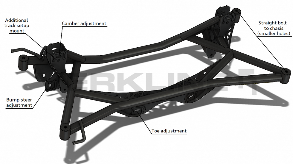 – Possibility of adjusting camber, toe and bump steer for improved suspension kinematics.